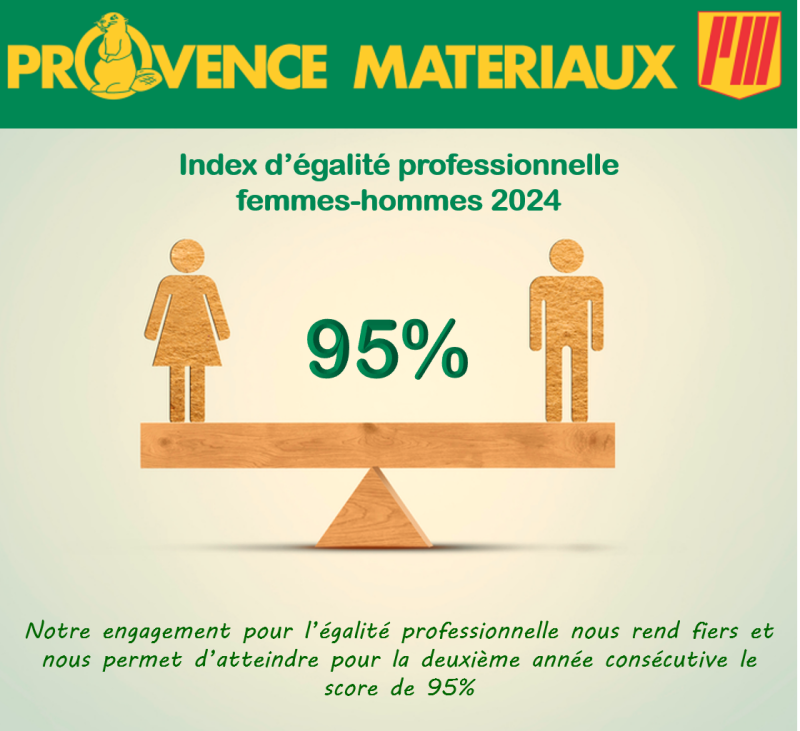 Comme le prévoit l'article L1142 - 8 du Code du travail, l'index d'égalité professionnelle entre les hommes et les femmes au sein de PROVENCE MATÉRIAUX a été mesuré pour l'année 2024.