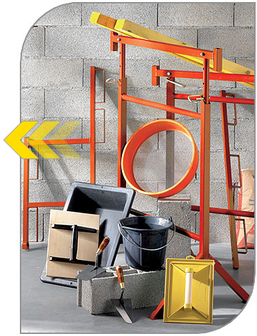 - seaux et auges de maçon, tamis, bacs à ciment